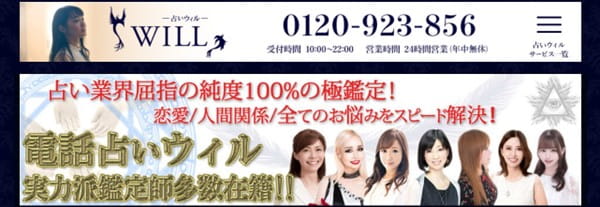 24時間いつでも占える「電話占いウィル」は、電話で本格的に占えると評判のおすすめ電話占いです。ベテランで質の高い占い師が多く在籍しており、さまざまな悩みに対応しているという特徴があります。