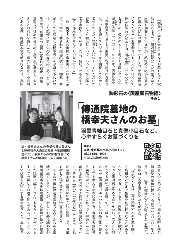 【メディア掲載】月刊石材(2025年11月号)に、弊社のお墓建立事例〈国産墓石物語〉その1が掲載されました 2025.11.15 弊社が建立させて頂いた、傳通院墓所の国民的歌手「橋 幸夫」様と、お墓についての取材記事が全4ページ渡って特集されております。 下記の画像をクリックしていただくと、記事をPDFでご覧いただけます是非、お気軽にご覧くださいませ 掲載雑誌:月刊石材2025年11月号 vol.542発売日:2025年11月15日