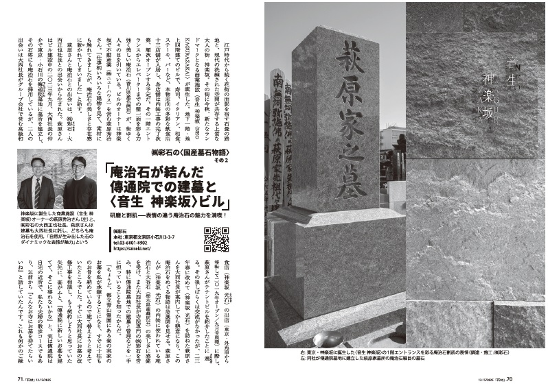 【メディア掲載】月刊石材(2025年12月号)に、弊社のお墓建立事例〈国産墓石物語〉その2が掲載されました 2025.12.27 オーナー様の建墓のご縁から、東京・神楽坂に誕生した「音生 神楽坂」との関係について、取材記事が全6ページ渡って特集されております。 下記の画像をクリックしていただくと、記事をPDFでご覧いただけます是非、お気軽にご覧くださいませ